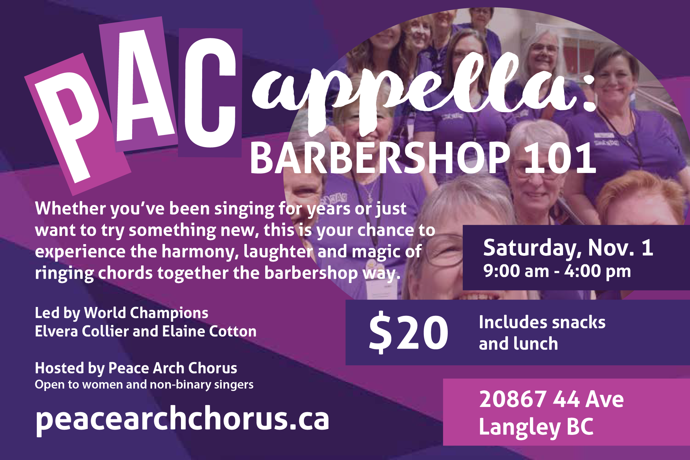 Peace Arch Chorus is a an award winning barbershop a cappella chorus open to women and non-binary singers